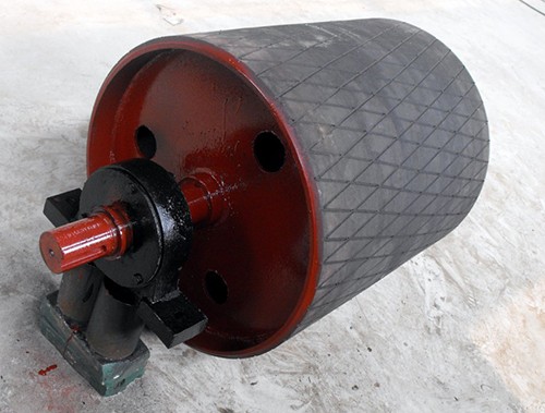 傳動(dòng)滾筒是輸送機(jī)傳遞動(dòng)力的部件。其驅(qū)動(dòng)帶式輸送機(jī)的方式有單滾筒、雙滾筒及多滾筒之分。單滾筒多用于功率不太大的輸送機(jī)上,如煤礦地面運(yùn)輸及選煤廠等處。井下帶式輸送機(jī)一般均采用雙滾筒,以使輸送機(jī)結(jié)構(gòu)緊湊。傳動(dòng)滾筒表面有裸露光鋼面,人字形和菱形花紋橡膠覆面。小功率、小帶寬及環(huán)境干燥時(shí)可采用裸露光鋼面。人字形花紋膠面摩擦系數(shù)大,防滑性和排水性好,但有方向性。菱形膠面用于雙向運(yùn)行的輸送機(jī)。